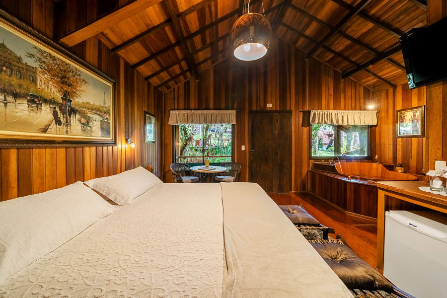 Eleve sua estada com o charme e o calor de nossas Cabanas com ofurô e lareira. Delicie-se com um banho aromático privativo e aqueça a noite ao lado da lareira. Com charmosas varandas e vista privilegiada para o bosque, estas cabanas de madeira são totalmente equipadas para um descanso inesquecível com máximo conforto. Incluso: café da manhã, WI-FI, estacionamento e acesso à infraestrutura.